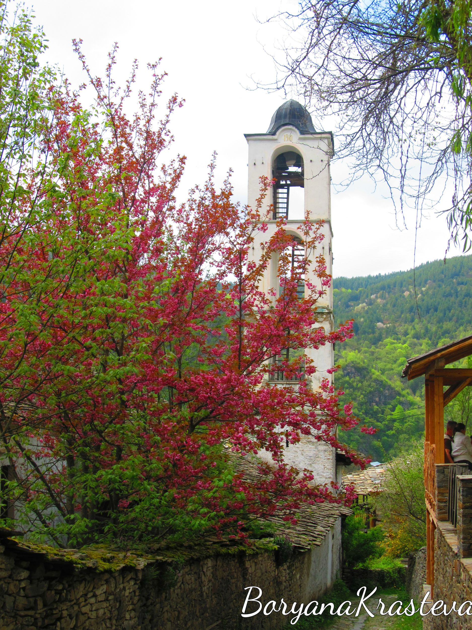 Изведнъж от нищото се показват каменните покриви на първите къщи, които ме приветстват. Сред тях се издига бяла и стройна, четириетажна камбанария – най-високата в Западни Родопи. Няма съмнение – това е Ковачевица! Селото ме посреща притихнало и замислено. От двете ми страни се редят кичести дървета с приведени клони. Стъпвайки на прашния път, чувствам, че съм се завърнала към нещо познато. Нали знаете гъделичкащото чувство, когато минете покрай улицата, на която сте играли като малки или прекрачите двора на бабината ви къща, в която сте правили не една или две бели. Ето такъв гъдел усещам и аз в планинското селце.