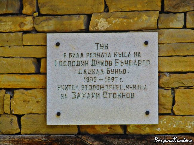 С крайчица на окото виждам огнено оранжеви цветове, блещукащи в отсрещния храст. Добре,че беше той, иначе без малко да отмина къщата-музей на Захари Стоянов. Зад високия ѝ зид се подава внушителният паметник на революционера. Студенината на камъка контрастира с топлите цветове в градината. За съжаление виждам всичко това, надигайки се на пръсти и търсейки малки пролуки в каменния зид, от които да надникна. Причината е много прозаична – понеделник е, а в този ден музеят не работи. (Тук нямам късмет, но пък в Котел съдбата ми се усмихна, но за това във втората част). Пообиколих къщата от всички страни и с нескрито разочарование поемам към центъра на селото.