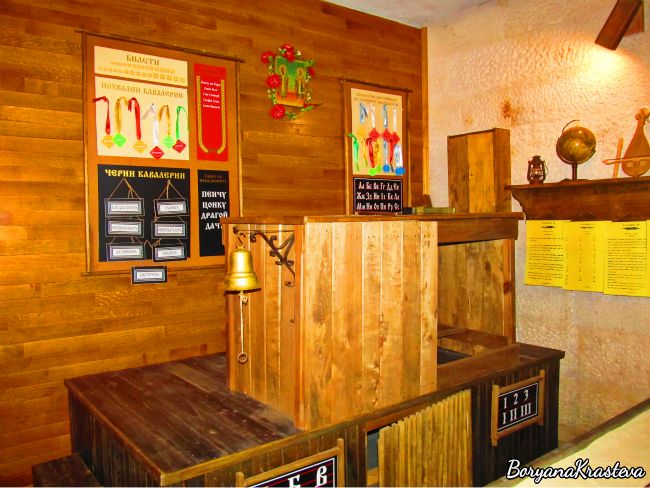 Спускам се по мраморните стълби към първото ниво на музея, посветено на будителите и по-специално на Софроний Врачански. Разхождам се между първите печатни книги, някои от вещите на книжовника и стигам до първия препис на „История славянобългарска”. Тук е пресъздадена и атмосферата във взаимните училища с пясъчните чинове и катедра със затвор за наказания. На стената висят табели с надпис: „Лъжец”, „Крадец”, „Смутител”, „Неприлежен”, които някога са се окачвали на провинилите се ученици. Добрите също са получавали такива табелки, само че с похвали. Не знам дали е било правилно или грешно, но е факт, че през този период българската просвета процъфтявала.