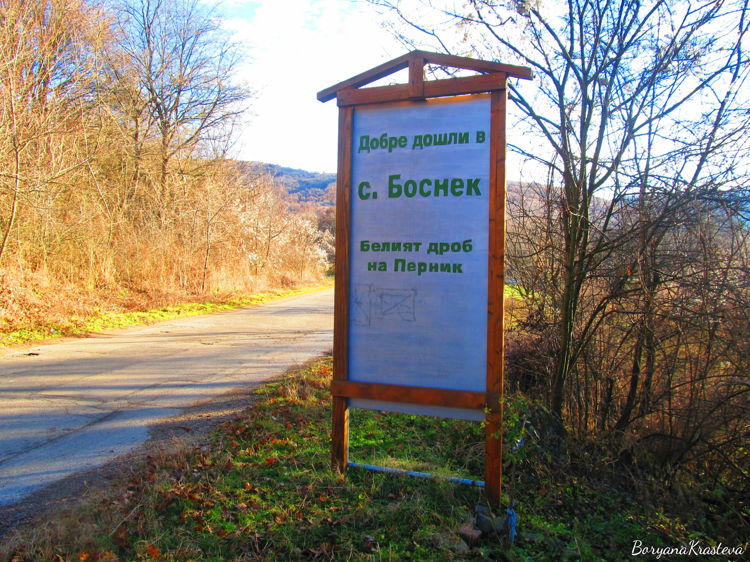 Събота сутрин – любимото време за нови открития. Отваря се прекрасно време – ясно небе, мека хладина, мирис на студен и свеж въздух и гальовност на слънцето. Аз и моят спътник на пътя (и в живота) пътуваме от София към Перник. Плъзгаме се по сивия асфалт в очакване на синя табела с отклонението за Боснек. Внимавам да не я пропуснем, защото след това обръщането ще е трудно. „Ето я,ето я” – ентусиазирам се аз. „Да,видях я”- леко иронично подмятане от лявата ми страна и после всеобщ смях. Пътят се извива и се шмугва под магистралата. Растителността около нас се сгъстява. Не след дълго виждам разперените, сухи клони на вековен дъб.