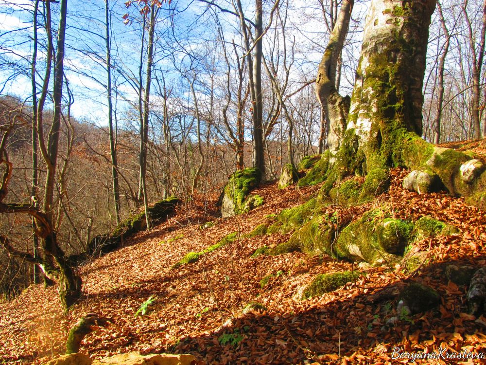 Правим първа и единствена почивка. Поемам въздух и събирам слънце. Разкършвам се, докато вратът ми изпуква. Тъй като е минал само половин час откакто сме тръгнали, мисля, че целта ни е още далеч. След няколкостотин метра обаче пейзажът се променя. Във вътрешността на гората зимата отстъпва място на есента. Краката ми започват да ровят в килим от оранжеви листа. Прескачаме реката, която се разлива от коритото си.