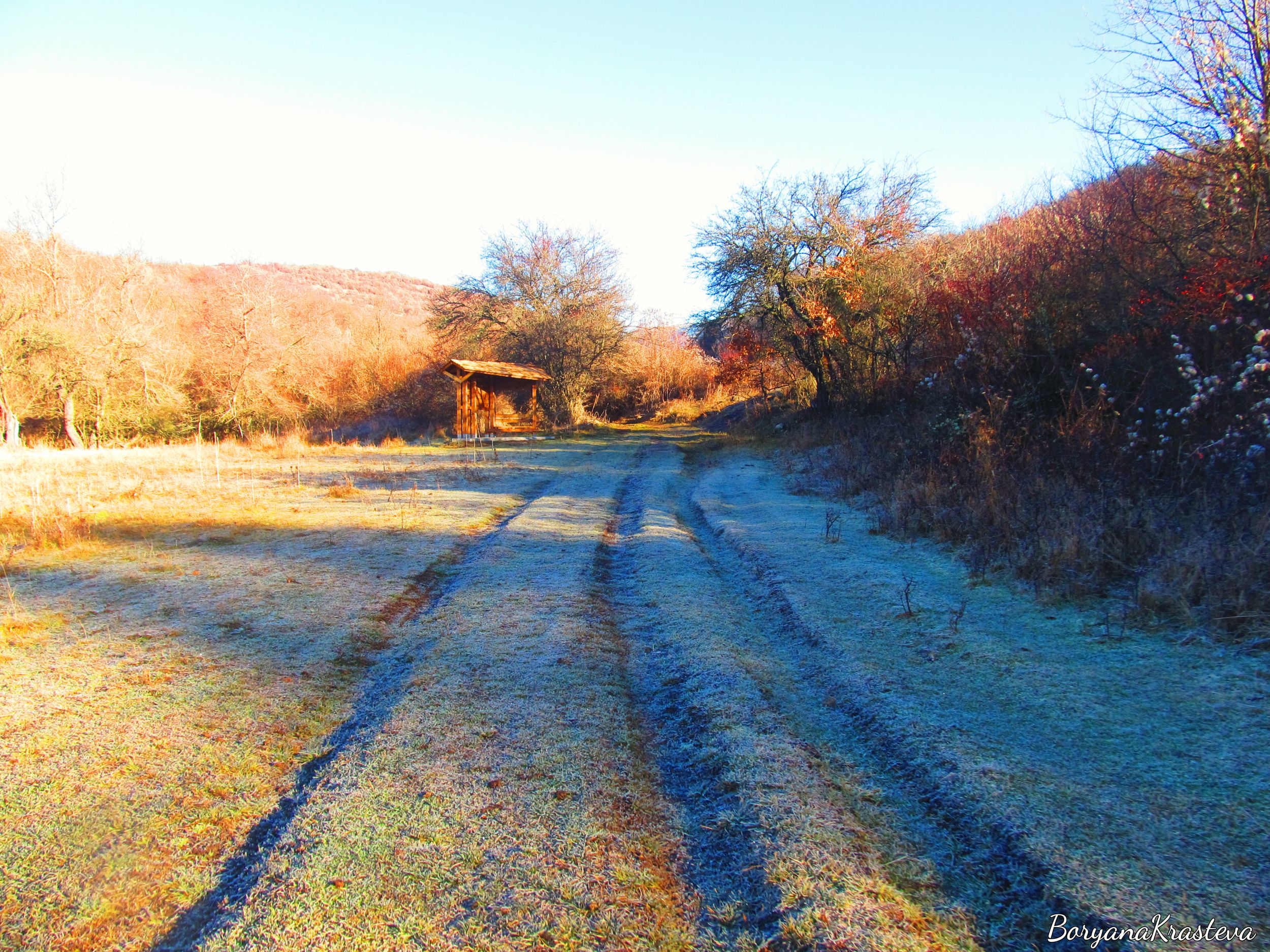 Оставяме колата накрая на селото. Стъпвам на пътеката и потръпвам от лек хлад. След няколко метра прекосявам границата между слънцето и сянката и попадам в заскреженото царство. Земята прилича на сладкиш, покрит с пудра захар, която хруска под краката ми. Скреж е полепнал по клоните и кората на дърветата, по върховете на тревите. Неестествено тихо е. Дъхът ми чертае неразгадаеми форми във въздуха. Всичко е толкова мистично – като пейзаж от детска приказка, чак ми се струва нереално.