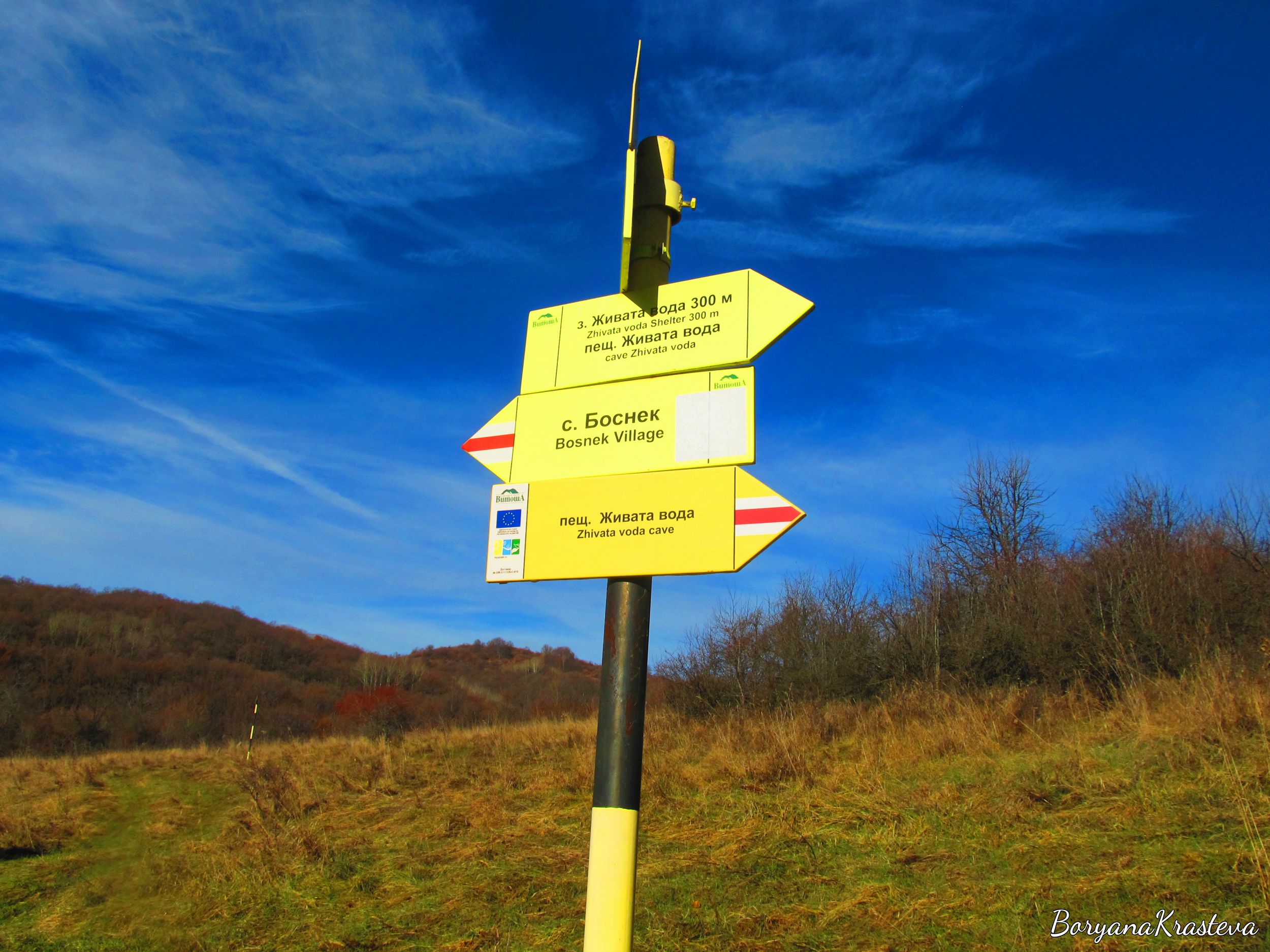Наближаваме кръстопът, в далечината виждам жълти указателни стрелки. Предполагам, че са за нас. Но само след миг се появява приведена старица. Потраква с дървения си бастун при всяка крачка. Няма как да пропусна да разменя две-три приказки с нея. Поздравявам и питам за посоката. Вътрешно я знам, но просто си търся повод да завържа разговор. От местните можеш да научиш неща, които няма къде да прочетеш. Налага се да повтарям въпроса си два пъти на висок глас, защото бабата недочува с едното ухо. Когато обаче ме разбира, се оживява и започва да размахва бастуна над главата си, искайки да ми обясни как да стигна до целта. Разказва ми още интересни истории за извора, които ще ви споделя малко по-надолу, за да не развалям изненадата. Разделяме се с „Хайде със здраве”.