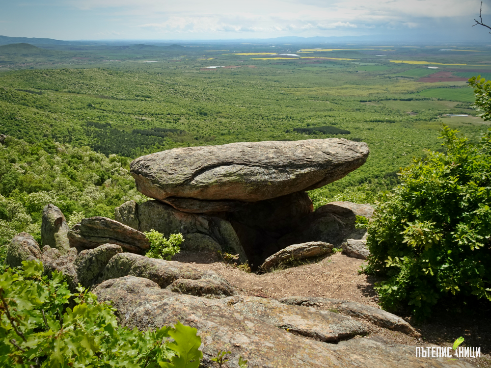 Първото нещо, което виждам, е огромната каменна плоча – покривът на протодолмена. А зад него хоризонта. Нищо не помрачава гледката. Пролетта е окичила всичко в най-различни нюанси на зеленото.