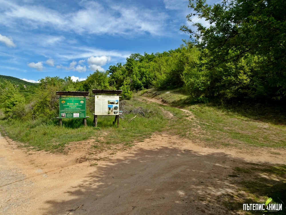 Пътят минава покрай него и изведнъж от дясно видяхме табела за „Плочата“. Това е и началото на пешеходния маршрут.