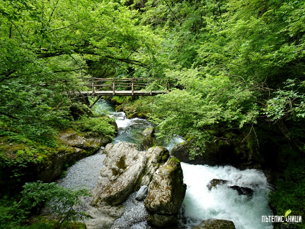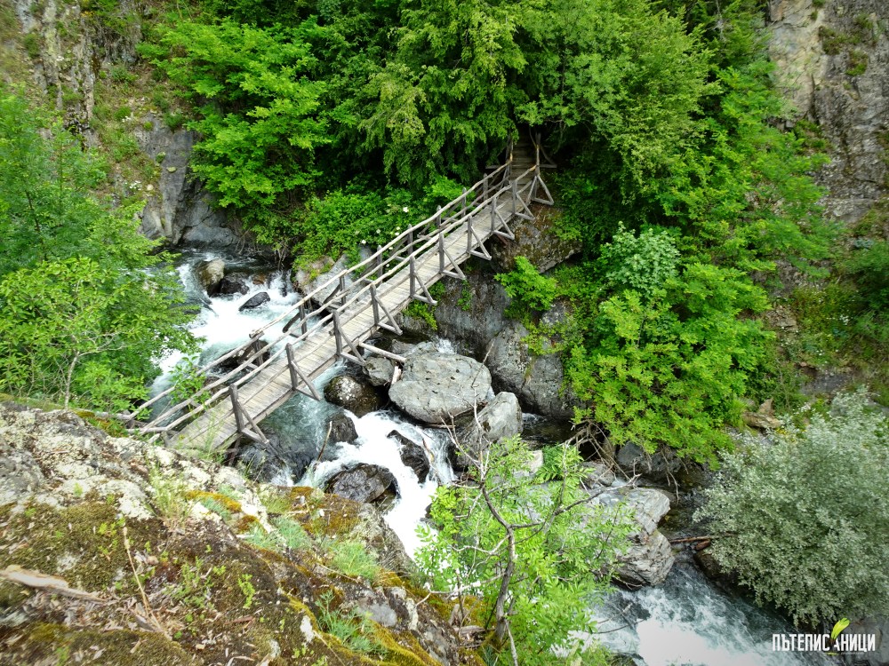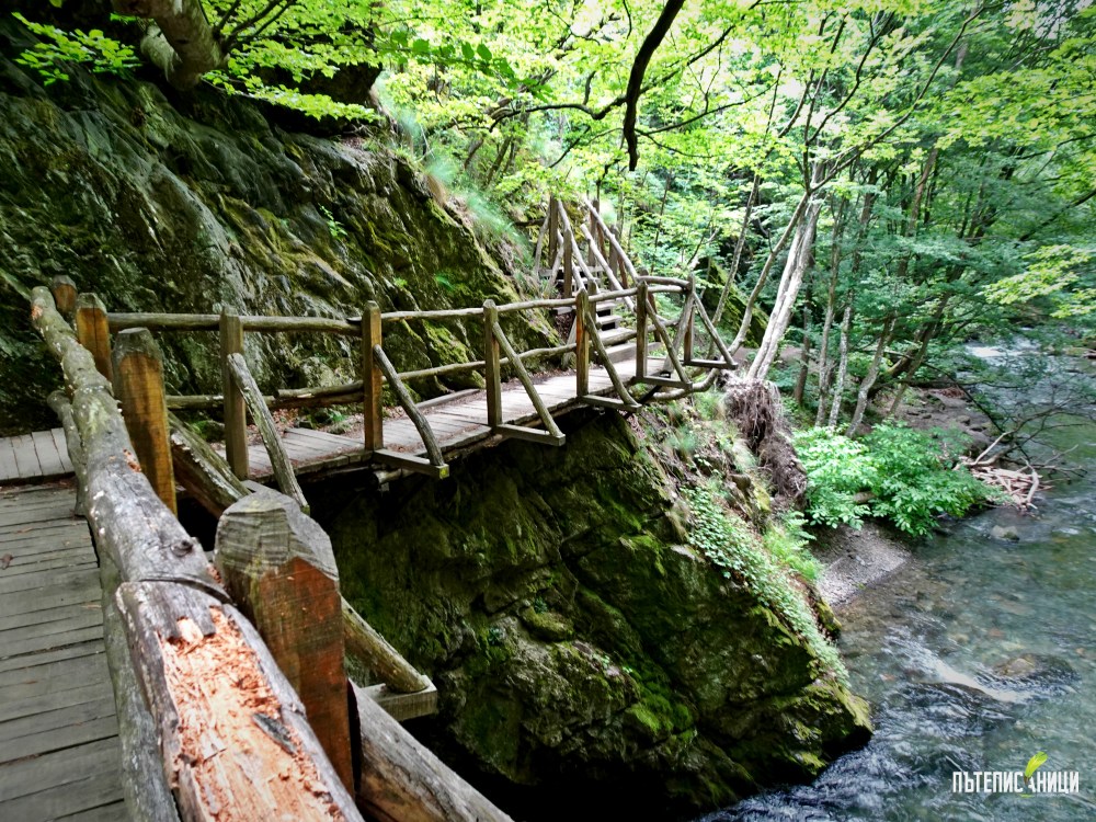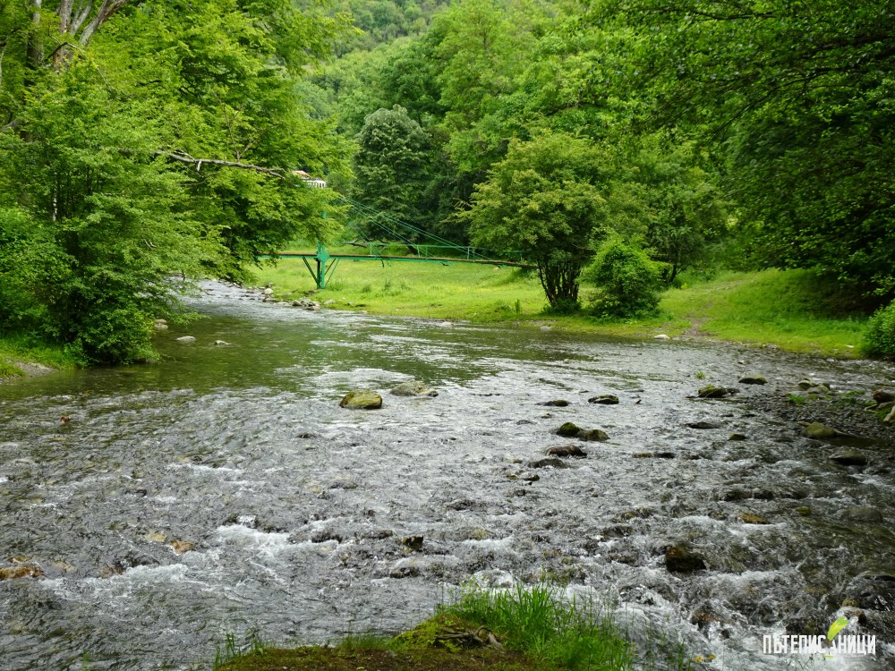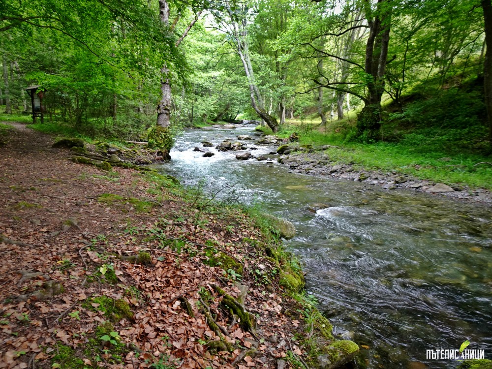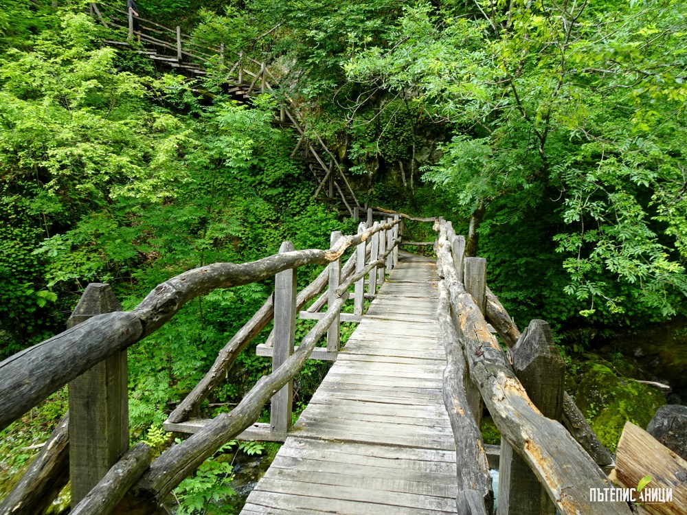 Оттук започва пешеходният маршрут. Пътеката е широка, равна и се движи покрай реката. Ухае на гора след дъжд. Прегърнатите клони не позволяват на слънчевите лъчи на пробият и кората на дърветата е още мокра от вчерашния дъжд. Ето и първото мостче по маршрута: