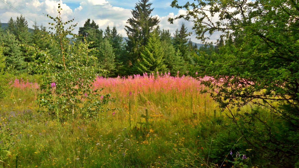 При това ни посещение полянката в началото на пътеката беше отрупана с цветни билки, а уханният Иван-чай беше обагрил всичко тук в лилаво.