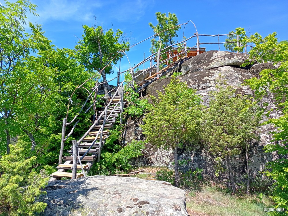 Светилището се намира върху самата Глава. От всички страни е заобиколено от пропасти. По скалите още ясно личат изсечените стъпала и улеите, сякаш неговите създатели допреди малко са били тук. Гледките от върха на светилището са пленителни – планини чак до хоризонта. Черпя ви с една панорамна снимка, за да добиете по-добра представа за мястото. Широкоъгълният режим върши чудеса!