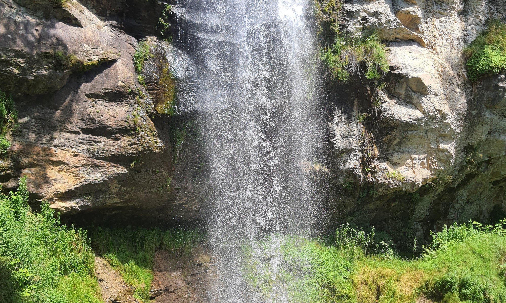 За да се доближим до водопада, минаваме по малък мост и се изкачваме по горска пътека. Разбиващата се в скалите вода образува полупрозначна мъгла. Водните капки танцуват във въздуха и носят приятна хладина.