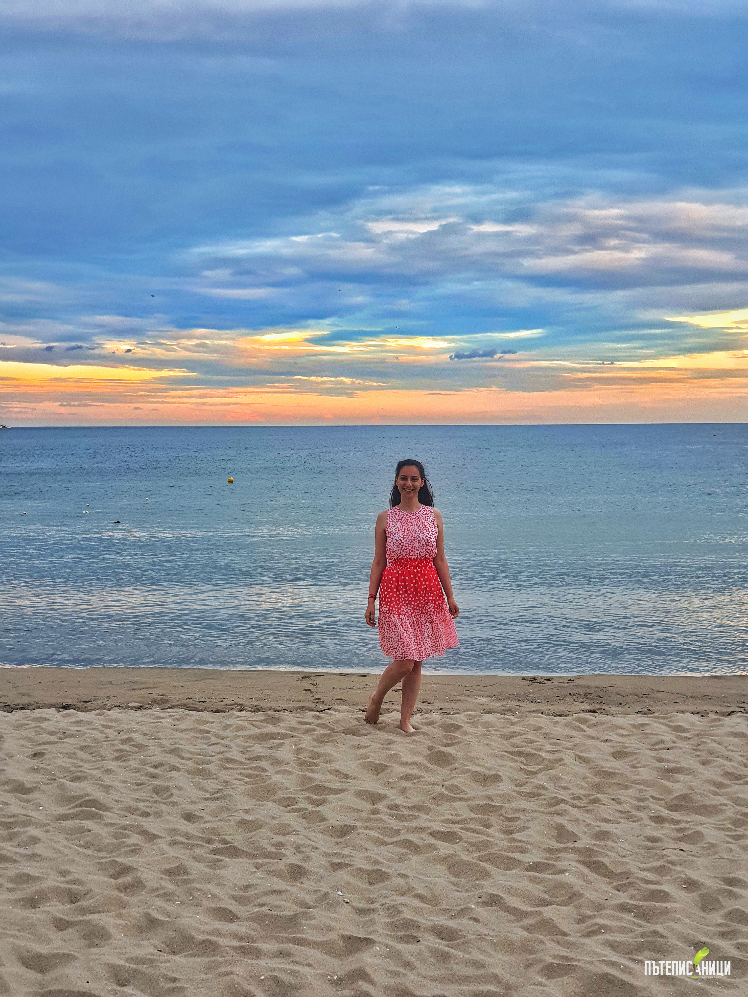 След вечеря си обличам новата любима рокля и отиваме на разходка по брега на морето. Обувките бързо стават излишни и стъпалата ми усещат изстиващия пясък. Тук-там се мяркат окъснели на плажа туристи, най-вече чужденци. Слънцето избухва в пищен залез, във всички нюанси на жълто, оранжево и червено. Вълните танцуват с брега, покриват го и пак се прибират в морето. Изведнъж, сякаш от нищото, изгрява дъга, а зад нея още една. Морският бриз роши косите ми, забивам пръсти в пясъка, докато една вълна не ме плисва и изважда от сладкия унес. Времето се процежда през най-тесния пясъчен часовник, а аз му се усмихвам, докато последните златни лъчи се стопяват зад гърба ми.