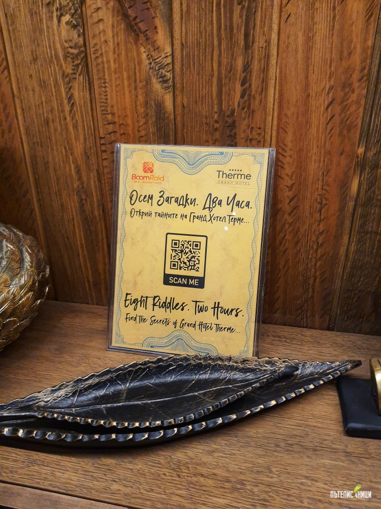 Осем загадки за два часа, това е играта, която привлича погледа ми, докато съм в лоби бара на хотела. Сканирам QR кога и играта започва. Решаваме загадки, анаграми, търсим различни места в хотела. Справяме се сравнително бързо, но е интересно отново да разгледаме различните пространства и да обърнем внимание на някои детайли.